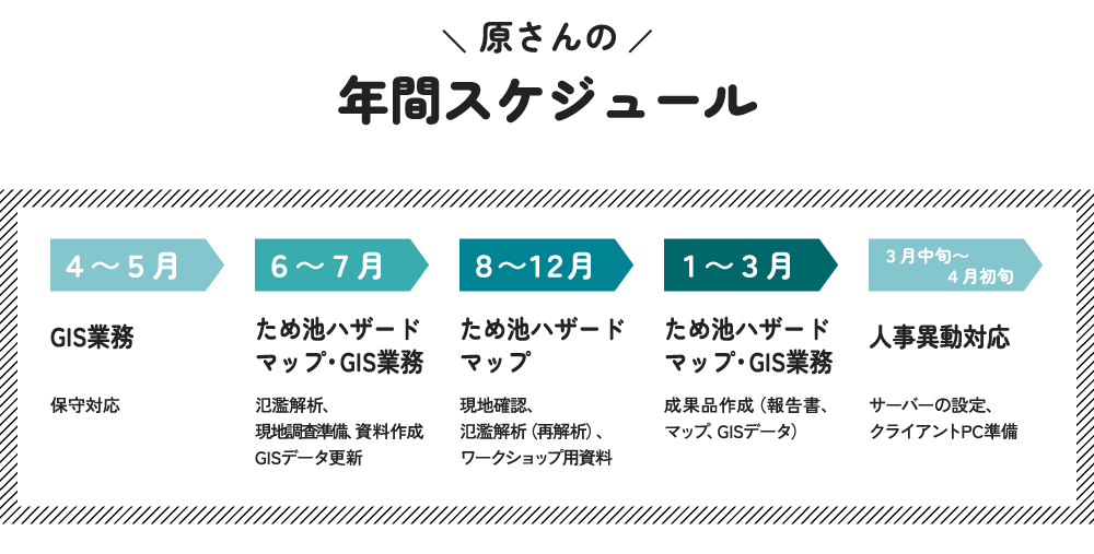 OAやGIS関連の仕事は、会員や他課の職員がシステムを使って思う存分仕事ができるように、後方からサポートする仕事です。表舞台に出ることは少ないですが、大きなやりがいのある仕事です。 他課の仕事と同様に、水土里情報課でも「前例どおり」「他の案件と同じ」は通用しません。発注者の意向を正しく汲み取った上で、今後の見通しも踏まえた提案を行います。案件ごとに最適な回答は異なりますが、真剣に考えるほど「頼んで良かった」「次回もよろしく」と言っていただけます。このように言っていただけるような関係を継続できるよう心がけています。